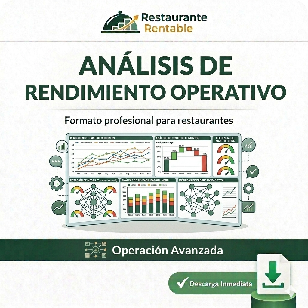 Plantilla diseñada para evaluar el desempeño operativo del restaurante. Permite analizar la eficiencia de los procesos, identificar áreas de mejora y optimizar el funcionamiento del negocio.